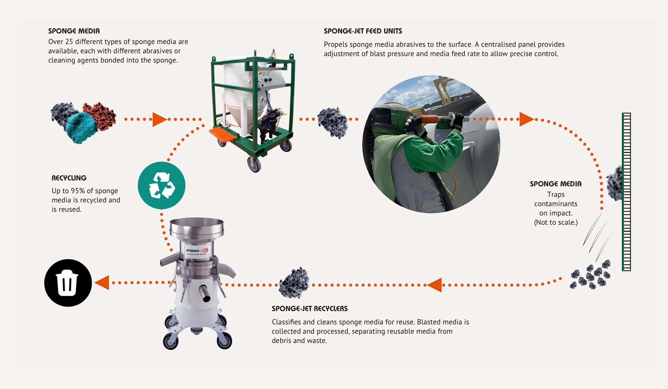Sponge-Jet’s MicroContainment Technology™ embeds high-quality micro-abrasives into a durable synthetic sponge, creating a recyclable media that can handle everything from heavy-duty surface profiling to gentle cleaning. Combined with their precision blast equipment and efficient recycling systems, Sponge-Jet delivers a comprehensive solution.
